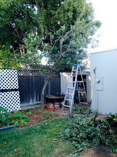 I've probably destroyed any chance of an apricot harvest next year with the severe pruning, but the tree is no longer touching the roof, is no longer tangled in the wires, and is no longer casting its ever-growing shadow across the squash and cucumber in the veggie bed. And even if I don't get any fruit, the detestable varmints won't get any fruit next year either. Ha.