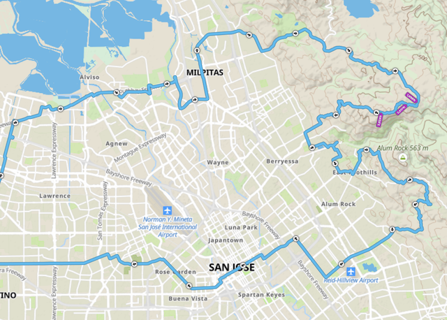 Ma April 17, 2020 #Shelter-in-placeChad and I escaped for a ride this morning/early afternoon and rode toward the foothills on the east side of San Jose. 58 miles later with 4000 feet of mostly steep climbing, our collective legs are tired. Nice ride, nice day after the clouds burned off. We saw a herd of goats shuffled with a herd of sheep, a herd of running llamas (they lead with their heads down -- most odd-looking!), a second herd of goats -- with horns instead of sheep friends, a flock of turkeys, a herd of cows, a couple of horses, and an egret that swooped out in front of us. These hills east of town can feel surprisingly rural.