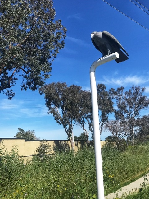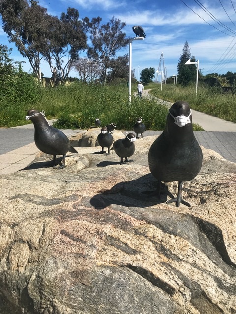 Today’s amusement was noting that the friendly neighborhood yarn-bomber has made tiny masks for the bird statues near the bike bridge over by the high school.