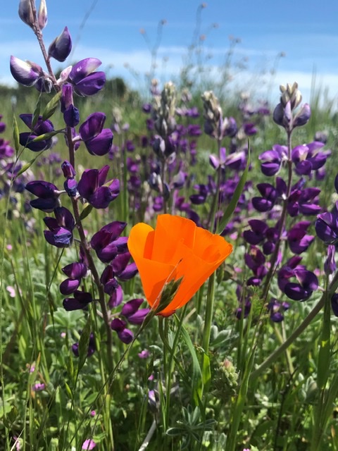 The ubiquitous California poppy, here set off against purple vetch.