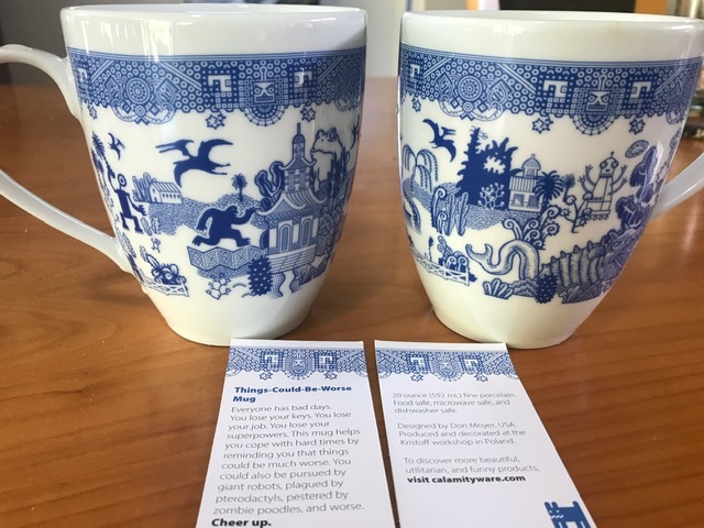 Day 50 of our captivity: New mugs Ma May 05, 2020 #Shelter-in-place Our big new mugs for morning coffee arrived a few days ago. Things Could Be Worse. ‹ Day 52 of our captivity: Dodging bunnies Day 49 of our captivity: Very small bug ›