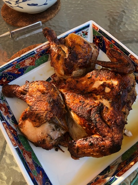 Fancy organic chicken butterflied and cooked on the grill sandwiched between two cast iron skillets with herbs de Provence—sort of a riff on “chicken cooked under a brick”. It was beautiful...and yummy.