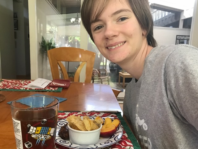 Ma June 02, 2020 #Shelter-in-placeKiddo thought I should be impressed by the food array consumed upon awakening today. A leftover sausage, a nectarine, potato chips, and iced tea. It did sort of cover all food groups...