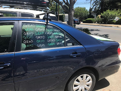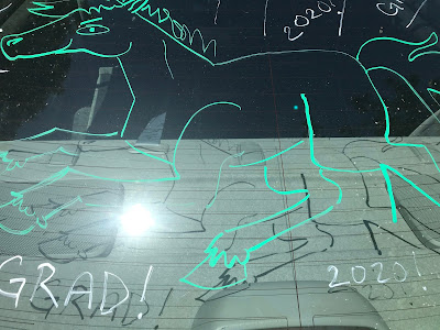 Of course, we had to decorate the car. Green banners courtesy of Mom, as well as my silly chalk marker drawings. I was particularly amused with my silly horse mascot drawing on the back windshield.