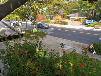 I walked down the street to intercept Nimue coming home from school at that point, so that she knew to go up the neighbors' driveway and under our peach tree to get around this: