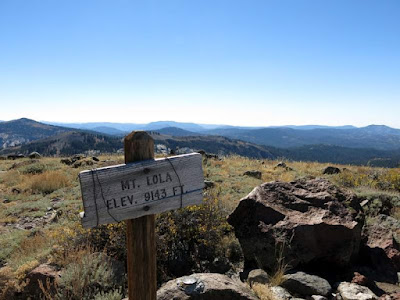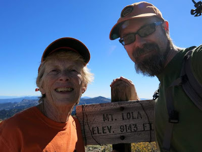 Mt. Lola is the highest peak in Nevada County. We chose to approach it from the north, taking the gentler route, but didn't want the full 10.5-mile round trip from the standard trailhead. Fortuately, our trusty truckster was up to the task of following the overgrown lumpy forest road up to a cheater entrance further up (and our trusty driver was up to wandering around a bit to find unmarked Forest Road 301-75 as it wound its way through the maze of logging roads...)