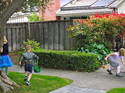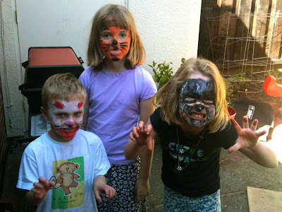 Continuing a now well-established pattern, we had a delightful Easter bruch with Todd & Sarah & kids. Above, you see the typical Easter Egg hunt; things then degenerated into post-candy crazed face paint imaginative play (below). Nimue's artwork: a bunny (somewhat devil-like) and a really scary raccoon. Cathryn painted the somewhat more benign-looking tiger.