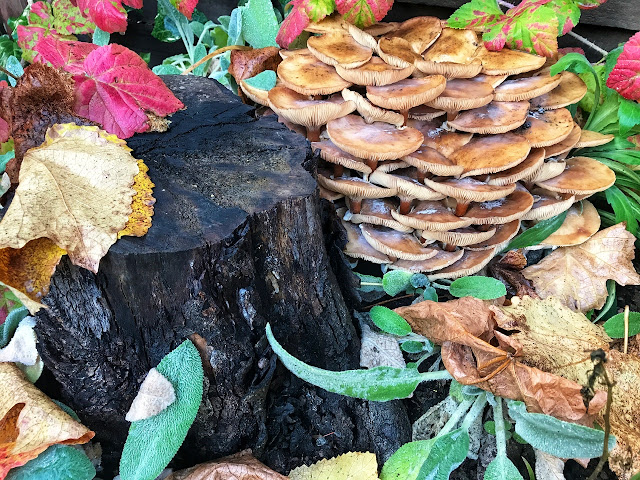 We have no holiday outings to embark upon here this year, aside from me singing with friends over Zoom last night, but at least the yard threw me a photogenic surprise when I was pruning yesterday: mushrooms!