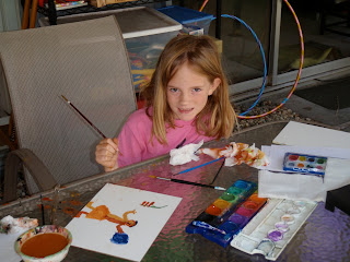 This morning, I found her out on the patio painting; upon a query regarding what it was, she answered "Kumbhakarna fighting the monkeys." She had noted a couple of images of this part of the Ramayana in the museum yesterday because we have the same scene in the form of one of Faith's excellent batiks hanging in our TV room. I like my quirky kid.