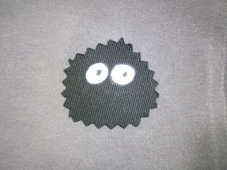 Ma August 03, 2012 #craftNimue, being an active kid, sometimes rips holes in her clothing. I recently repaired a favorite pair of pants by putting a soot monster patch (a la Miyazaki) on the knee, somehow improving the whole garment in Nim's eyes. Some iron-on patch material, pinking shears, a paint pen and 5 minutes: