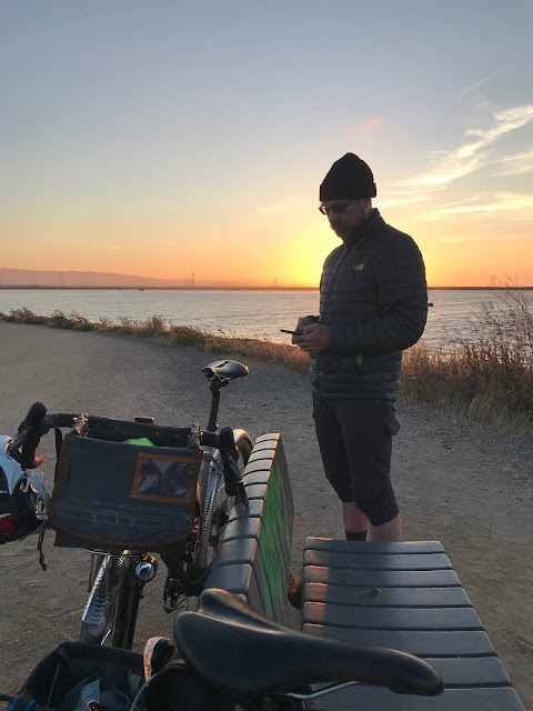 On the evening of the Fourth of July, we wanted to do something, but neither of us was in the mood to deal with the traffic and crowds associated with the normal events, so I looked at a map and tried to be creative. We thought about riding up a hill and watching fireworks across the bay from above, but had a hard time picking a good potential vantage point that would have a clear, unobstructed view from not too high up that would also be legal (parks and preserves all close at sunset). I did, however, notice that there was a stretch of the Bay Trail that didn't have any time-of-day restrictions on use, and remembered a handy bench. We loaded up our bikes with some snacks and went out to watch the sunset.