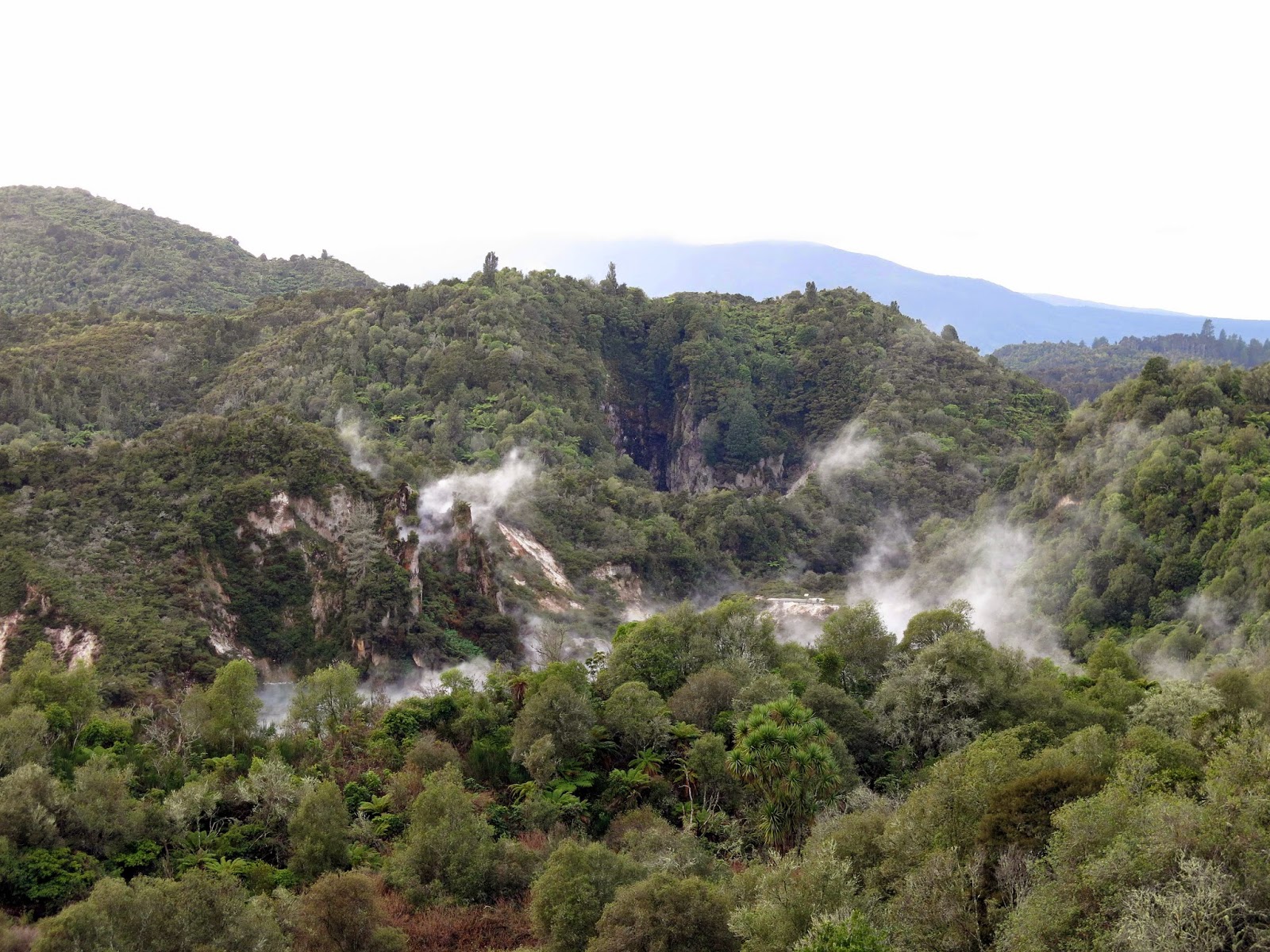 After poking around the city park, we headed half an hour south of town to visit Waimangu Valley, a steaming rift valley full of geothermal features that came into being after the 1886 eruption of Mt. Tarawera. This is now a park that you have to pay to get in, but the excellent self-guided hike that wound its way down the steaming valley was worth the price.