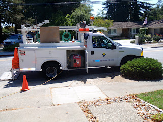 Ride home. Sunnyvale truck has arrived! Water from puddle has soaked into ground revealing long-lost sewer clean-out port underneath! Problem is between port and street! Very Large Motorized Snake deployed!