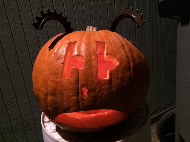 Yes, we did Halloween, in a half-hearted last-minute sort of way. Monday afternoon found me trying to clean things up a bit, cook dinner for us and Sarah and her kids, and frantically start scooping out pumpkins at 5 pm with a hand that was still a bit sore from the previous week's yard carnage. Needless to say, the pumpkins were not as carefully designed as they have been in previous years, but they were still properly Halloween-y.