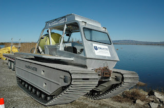 I had no idea these huge, ancient fish came in to the SF bay today; certainly they did once upon a time, but the only stories I had heard, even from when I was a little kid, had to do with sturgeon up in the Sacramento river. But apparently they do come in, following the tide - our fishermen were anticipating hooking a big one within the hour. Along the way, I spotted what must be the coolest marsh-travelling vehicle ever - the "Aquamog"!