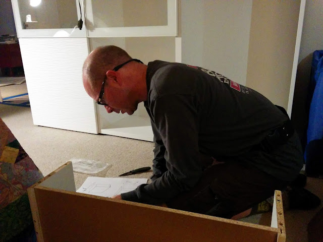 Ma October 25, 2016 #chores #house #chadIn an effort to set things up so that everything has a home in the bedroom, we recently headed to IKEA before dinner one night a week or so ago. We came out with a truckload of parts for a storage unit to replace Chad's old bureau. He rapidly went to work putting it together with his cute little impact screwdriver.