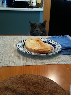 BikeBoy December 22, 2011The Bobber (aka Pretzel, the fluffier/more OCD of our two cats) likes anything even slightly buttery... such as this morning's toast.