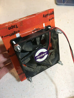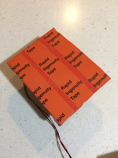 I had several old computer fans in a box, so I grabbed the biggest one. They're already speed-controlled to about the right speed for this. Hm, what has a big magnet? Why, an old hard drive of course! They have a couple of super-powerful magnets, and I have a big stack of dead hard drives from which I could scavenge. I also keep a box of assorted power supplies, so I easily found a 12VDC wall-wart to wire up to this. A few screws from the hardware store (but only because I didn't have anything long enough lying around), some foamcore from the craft closet, and a layer of Rapid Ingenuity Tape (Thanks Greg!) and voila - one ugly but highly-functional and super-cheap stir plate! Ta da. A thingy.