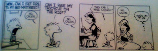 Nimue discovered my old Calvin and Hobbes books on the shelf a month or so ago, and we're now discovering just how many nefarious ideas a kid can get from them. She's been trying out variants of the above strip for weeks.