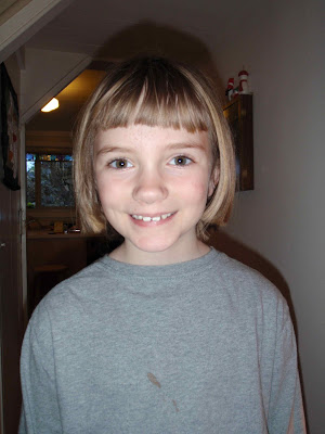 Nimue got sick of tangles in her hair, and decided that a short cut like her friend Cathryn's would be cute and practical. Plus, in her words, it would be fun to have a big change to freak out the boys in her class.