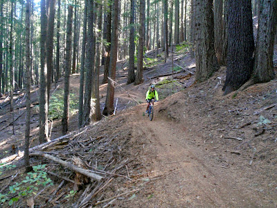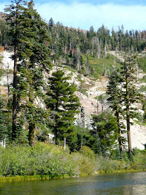 Oops. Not really what we set out to do. At one point, we hit a tricky spot within view of the lake, and used a lot of mind over matter power and all of Chad's careful skills to work through it, only to find that we should have scoped out the next section beforehand. A narrow toothy granitic yaw full of drops, roots, and boulders was just around the corner. Argh.