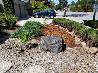 A slowly-evolving project, but this section of front yard that used to be almost entirely covered with evil ball-eating bushes is finally much improved. I also ripped out the expiring fava bean forest out of the veggie plot in the back and dug in the last 6 months worth of compost, so the tomatoes have a happy home in the ground now too.