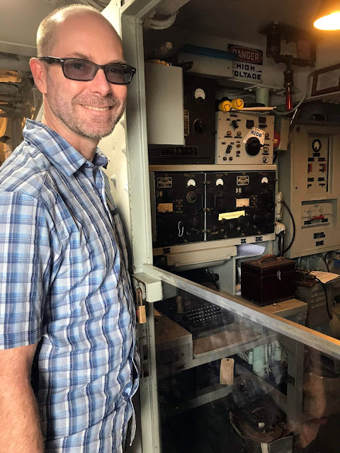 Chad near the communications room. He likes all the old technology (as does the kid!)