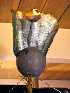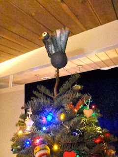 Nimue has been working hard on an ornament for the top of our tree this week, and finally finished it last night. Meet MacBeaky. MacBeaky has been driving me crazy. If you really want to bug Nimue, call him a turkey. (As in "Just put the last layer of paint on the turkey so I can have the kitchen counter back!")
