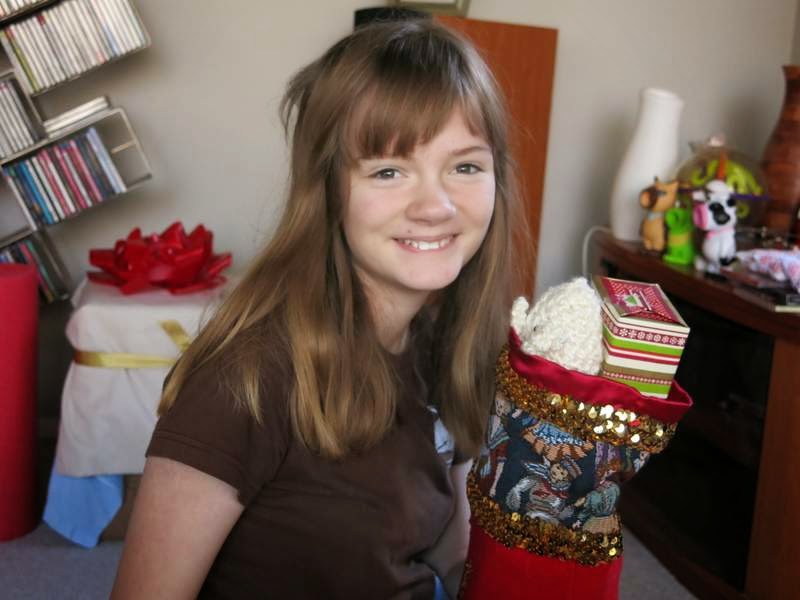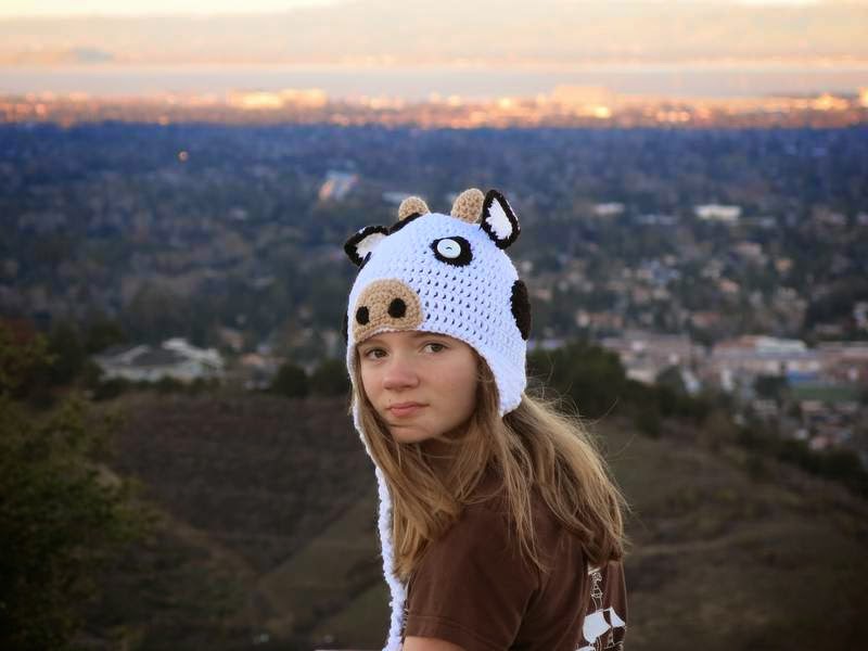 Nimue in her new cow hat. What other 12-year-old wants a cow hat for Christmas?