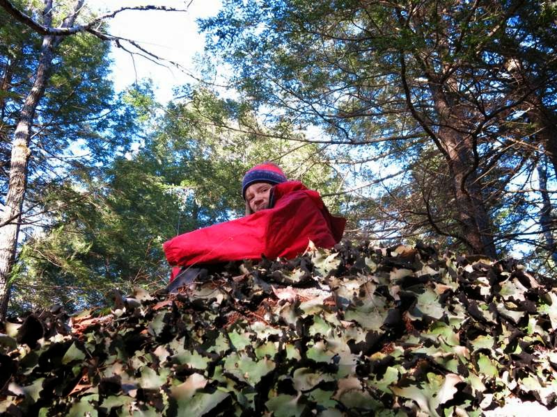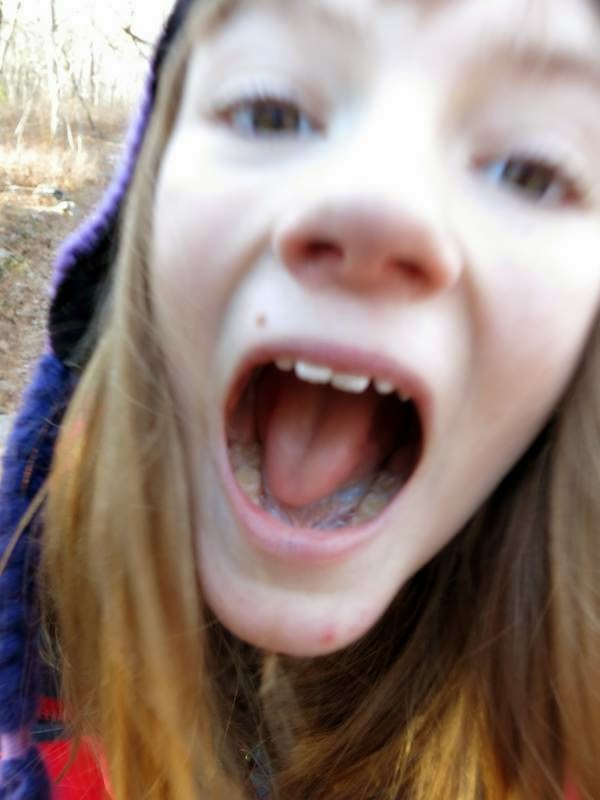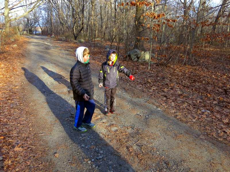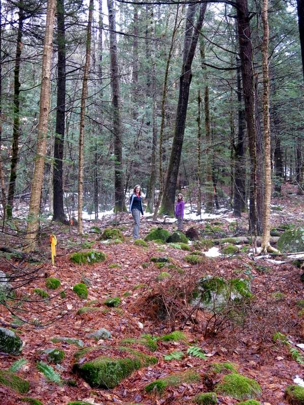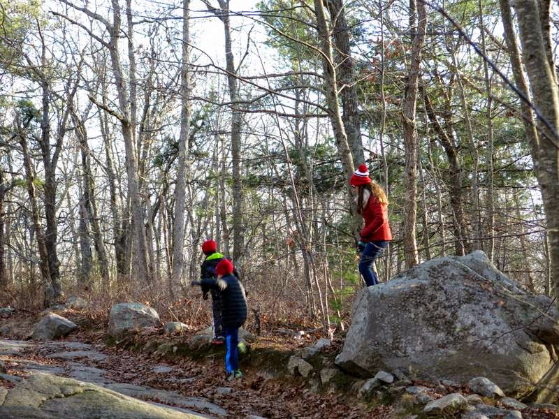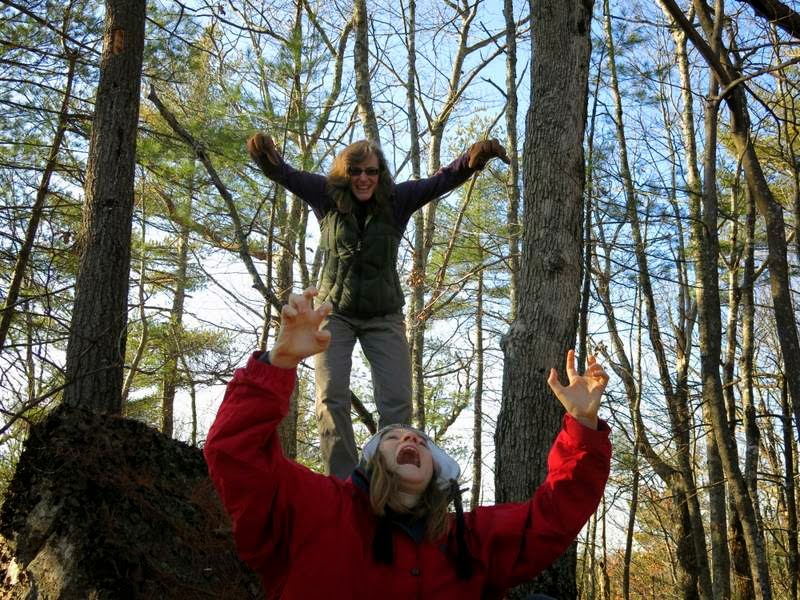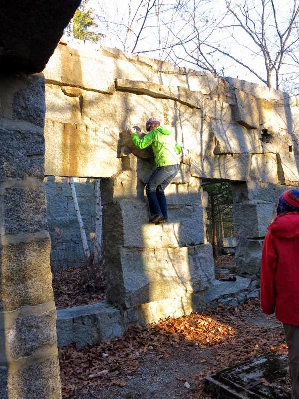 Ma climbs a stone ruin in the woods (then has to sheepishly point out to kids that they shouldn't be compelled to follow...)