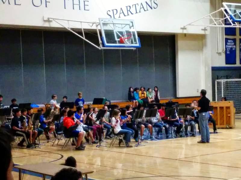 Nim playing in the band. (She is the left-most kid in the front row, wearing a white shirt with a bacon-colored striped shirt underneath; click on the picture to blow it up if you need to.)
