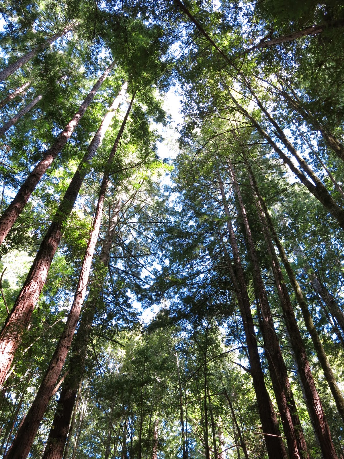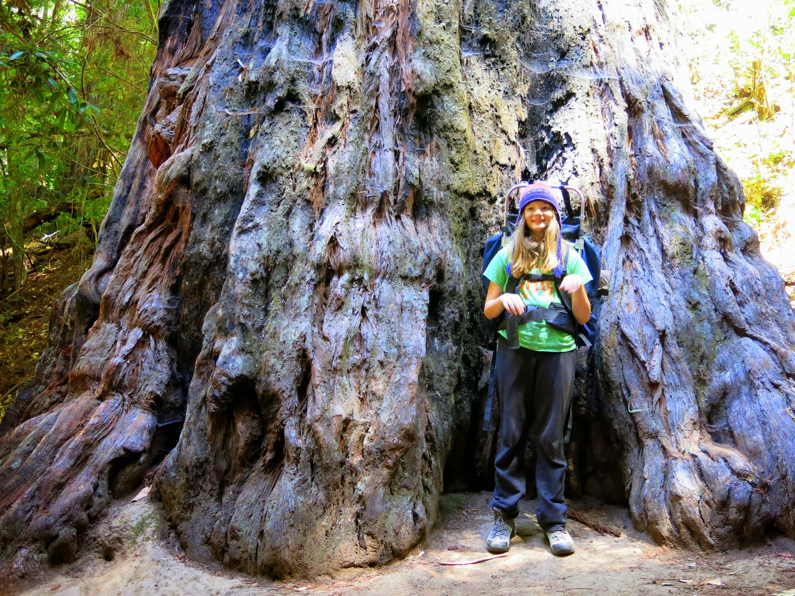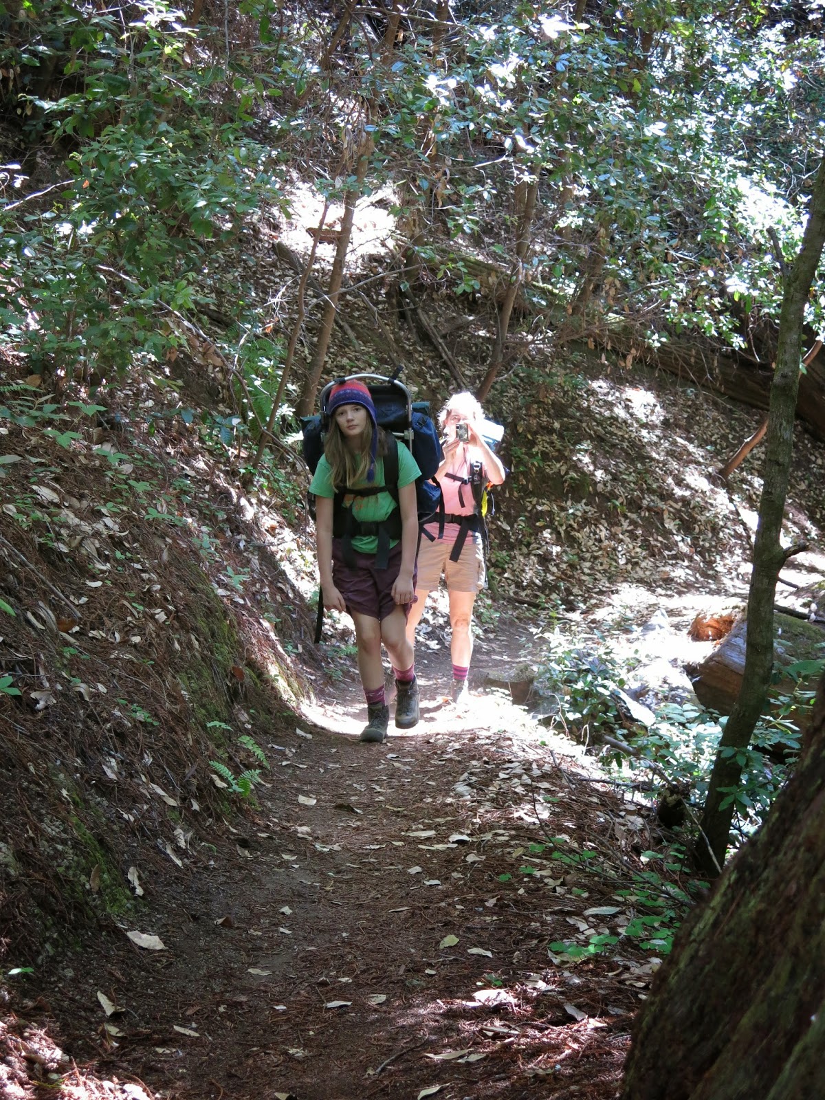 The trail snaked gently up through the redwoods for about 3 miles, going up maybe six to eight hundred feet. Nim was pretty cheery, except when hungry. We still forget just how often she has to eat.