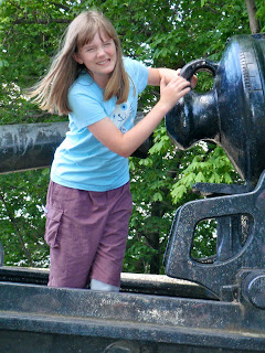 Nimue responds to parental goofiness by trying (and failing) to re-orient the cannon toward us.