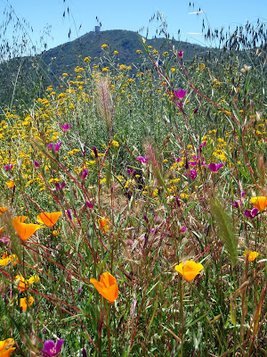 At some point, the grade levelled off a bit. I had an odd moment when I though "Gosh, this almost seems flat!", but then looked down at the bike computer and saw that it was still 12%. The previous crazy angles sure screw up one's sense of what's mellow. Still, I continued to stop to enjoy views like this one of Mt. Umunhum through a profusion of wildflowers:
