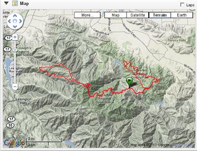 I started out at the parking lot at the top of Hicks Road and first headed into Almaden Quicksilver for an 11 mile loop on dirt roads. It was delightfully easy riding -- nothing too steep or technical, just nice views in many directions and lots of old mining structures left over from the days when this was a major mercury mining area. Also many wacky colored rocks, which isn't too surprising given the metal content of the local minerals. At one point, I looked out to the horizon to see Mt. Hamilton, and realized that from that vantage point, I couldn't see San Jose at all, or any other populated area for that matter.