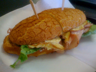 BikeBoy December 05, 2008 #lunch #food #local #restaurantThis is Country Deli's "Ed's Special" -- smoked ham and Gouda on a Dutch Crunch roll. Yummy! Their chocolate chip cookies are awfully good, too... Country Deli is small, local, family-owned and operated, and completely makes up for the no-frills furnishings with good food and friendly service. They make an excellent cappuccino, too!