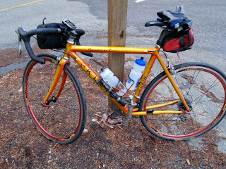 Ma March 19, 2009 #bikeI took a delightful long ride earlier this week, and as it exceeded the 50 mile range beyond which I get dreadfully hungry, I put the front bag on the bike. It may look a little goofy, but while other cyclists have to gnaw on dried-out quasi-food in bar form, I had a delightful sandwich, banana, and container of edamame. Mmmmm.