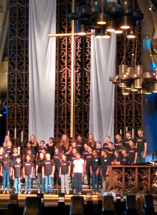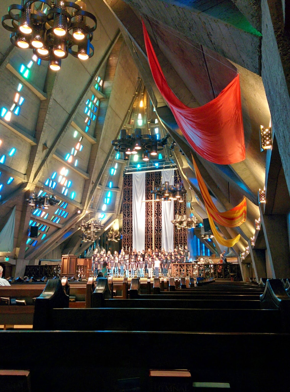 I also snuck into the "closed" rehearsal and took a few pictures. The church they sang in (First United Methodist in Palo Alto) was visually interesting, with lots of small trapezoidal colored windows, and I guess Nimue was amused by the maze of rooms down underneath.