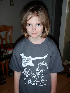 The Small One, after walking 59 laps at her school walk-a-thon last week. She just didn't stop -- not for bathroom, not for food, not for drink. I periodically handed her sustenance from the sidelines like one of those people who hold out the bags of food and water bottles during bike races.