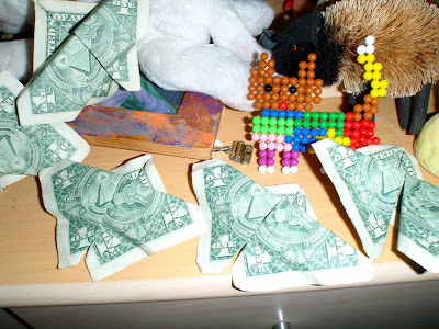 I went into Nimue's room this afternoon to look for something, and found that all of her money had been transformed into butterflies. Who needs to buy toys when you can make them?