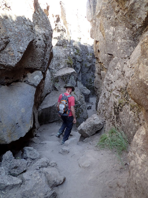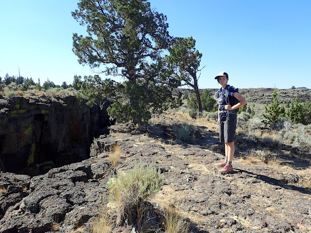 After those two sites, we hared off into the hinterlands and off of our guidebook to find Crack-in-the-Ground, a two-mile-long volcanic fissure caused by tension fracturing as a lava flow cooled. I found out about this obscurity when optimistically searching for information about slot canyons in the area -- none of those about, but Crack-in-the-Ground looked like it might feel like a slot canyon and thus was high on my mental list of places to check out.