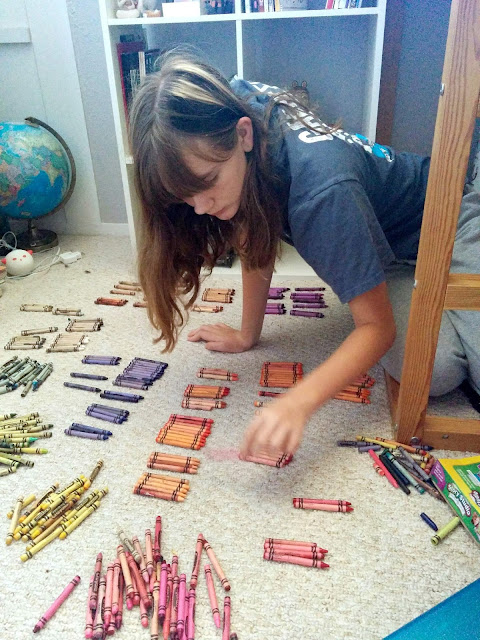 Room cleaning (and painting), followed by much sorting of crayons. Nim carefully kept one of each color, and then made a bag of remainders to donate, complete with itemized list of how many of each it contained. (Yes, a touch OCD this one is.) Note the newly light gray wall in the background is a great improvement over the old yellow.