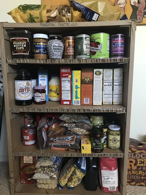 Ma June 12, 2020 #Shelter-in-placeA while ago, I got fed up with tripping over things. Boxes in the garage, overflow food in the TV room. Ugh. As a result, I decided to turn the sturdy box that the sink came in (so sturdy I knew it would come in handy someday — but also a trip hazard) into temporary shelving for the extra food we currently have on hand. I chopped up the lid to make shelves, and used the reinforced edge bits of the lid as shelf brackets. Most satisfying: there is no more heap of grocery bags on the floor, it didn’t cost anything, and I can just put it out with the recycling when we are done with it!