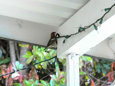 We watched them hard at work during breakfast for several days, but no nest was forthcoming. Upon investigation, I found a sad pile of twigs that had rained down on the bushes below the corner they were trying to colonize. Alas, the common house finch lacks both common sense and engineering skills -- this pair had spent days diligently trying to build a nest cantilevered out from a nearly nonexistent ledge.
