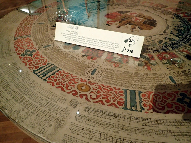 If we see signs for a "Museum of Historic Musical Instruements", we are can't help but follow them. The instrument collection was impressive, but I particularly liked this fine table from the sixteenth century, which had individual voice parts for music by Orlando di Lasso along the edges. I've sung an awful lot of Lasso over the years. Presumably, singers could arrange themselves around the table and have at it.