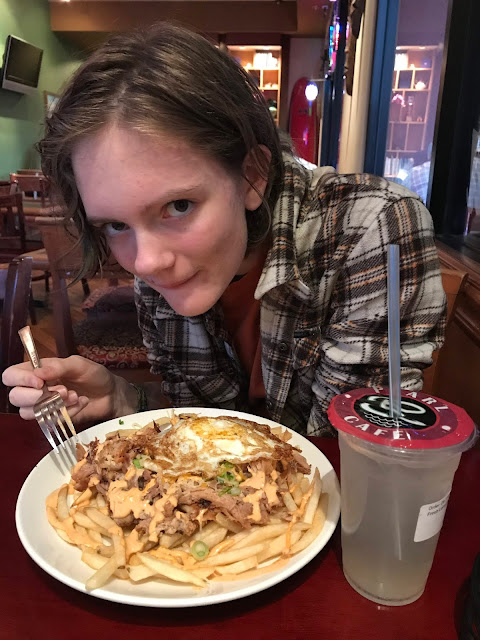 What does generate teen excitement is fries covered in Kalua pork and a fried egg.
