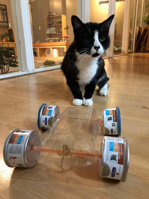 Yesterday, I came home from rehearsal to find the cats more intrigued by the rubber band car than the kid. Look kitty, it's made out of cat food cans!