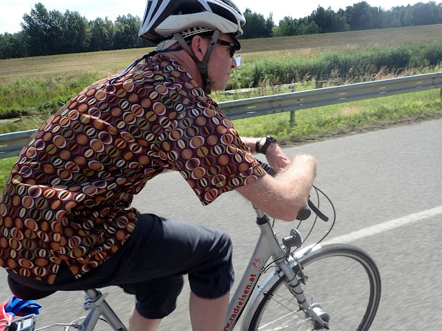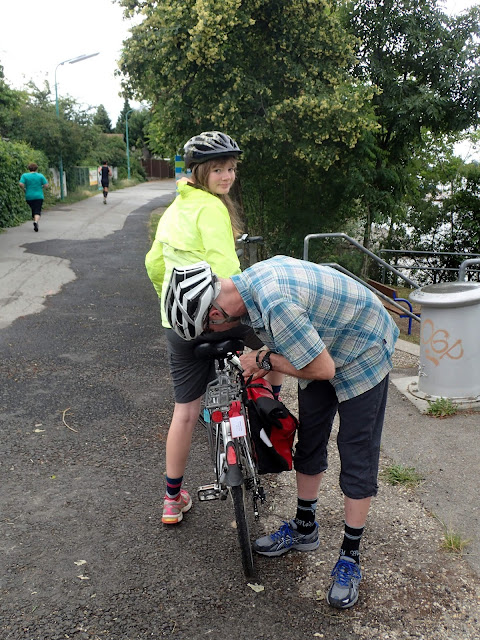 We had a minor adjustment to the kiddo too, as she had a sore wrist after sliding out on a wet cobbled speed bump to avoid running into Chad after he slowed down more suddenly than she expected. I don't think she saw the speed bump coming, and once the wheel started to slide, the weight of the bike made a tip-over inevitable. A ace-bandage-like object purchased for 0.77 Euro in Bratislava made a world of difference. As an added bonus, it gave me the interesting experience of explaining what I needed to a very nice Slovakian pharmacist through the language barrier.