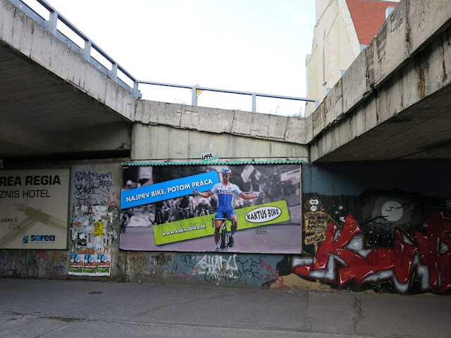 and we ran across a giant Peter Sagan billboard under a bridge. (For those not in the know, he's a highly entertaining and impressively talented Slovakian bike racer, who happens to currently be in the lead in the green jersey competition in the Tour de France.)