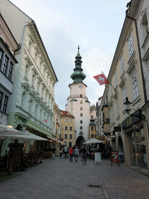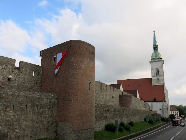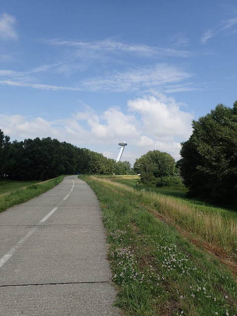 Toward the end of the riding day, the sun came out, and we saw a curious tower rising in the distance. As we got closer, we realized it was a support tower for the bridge on which we made our second Danube crossing, into Bratislava.